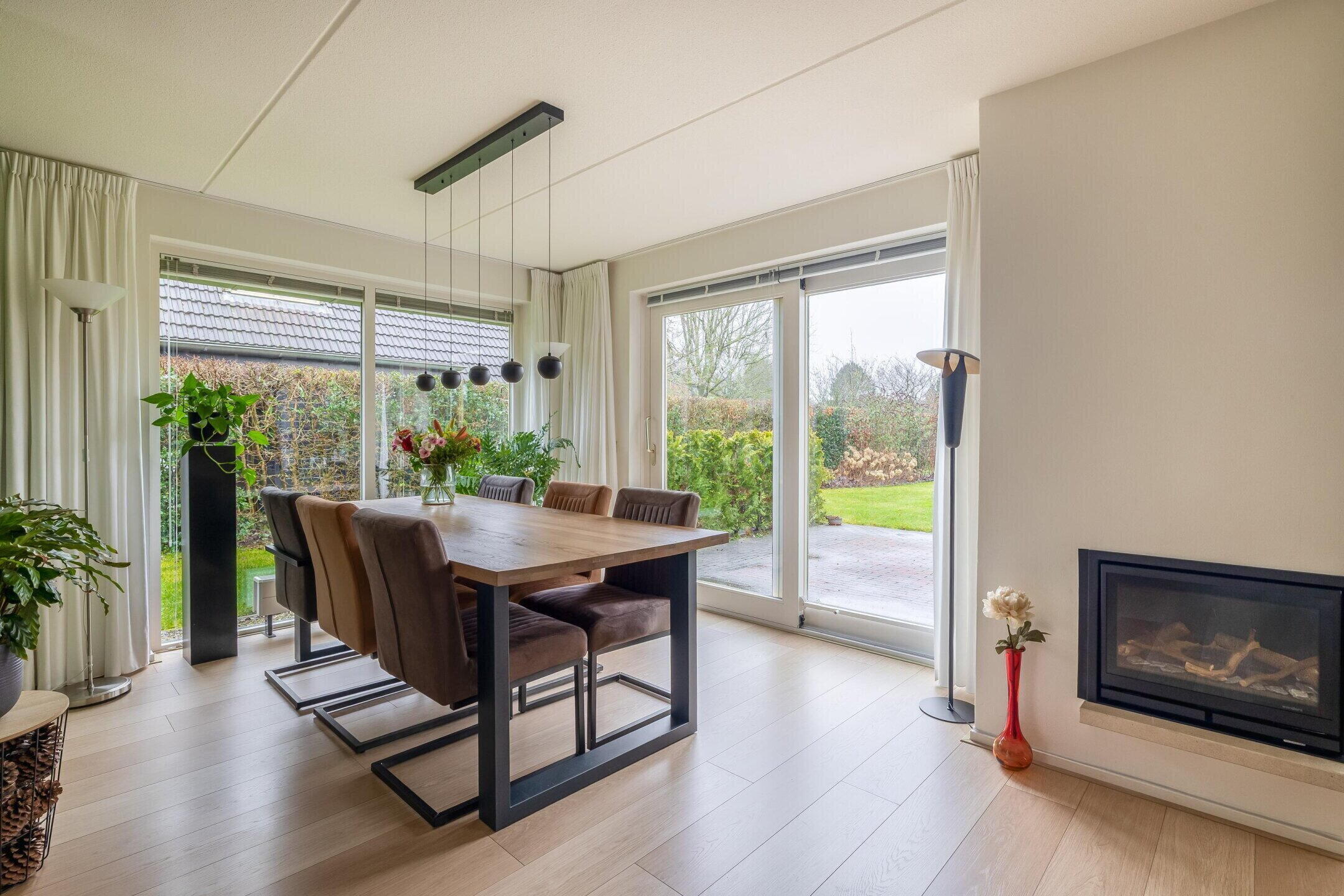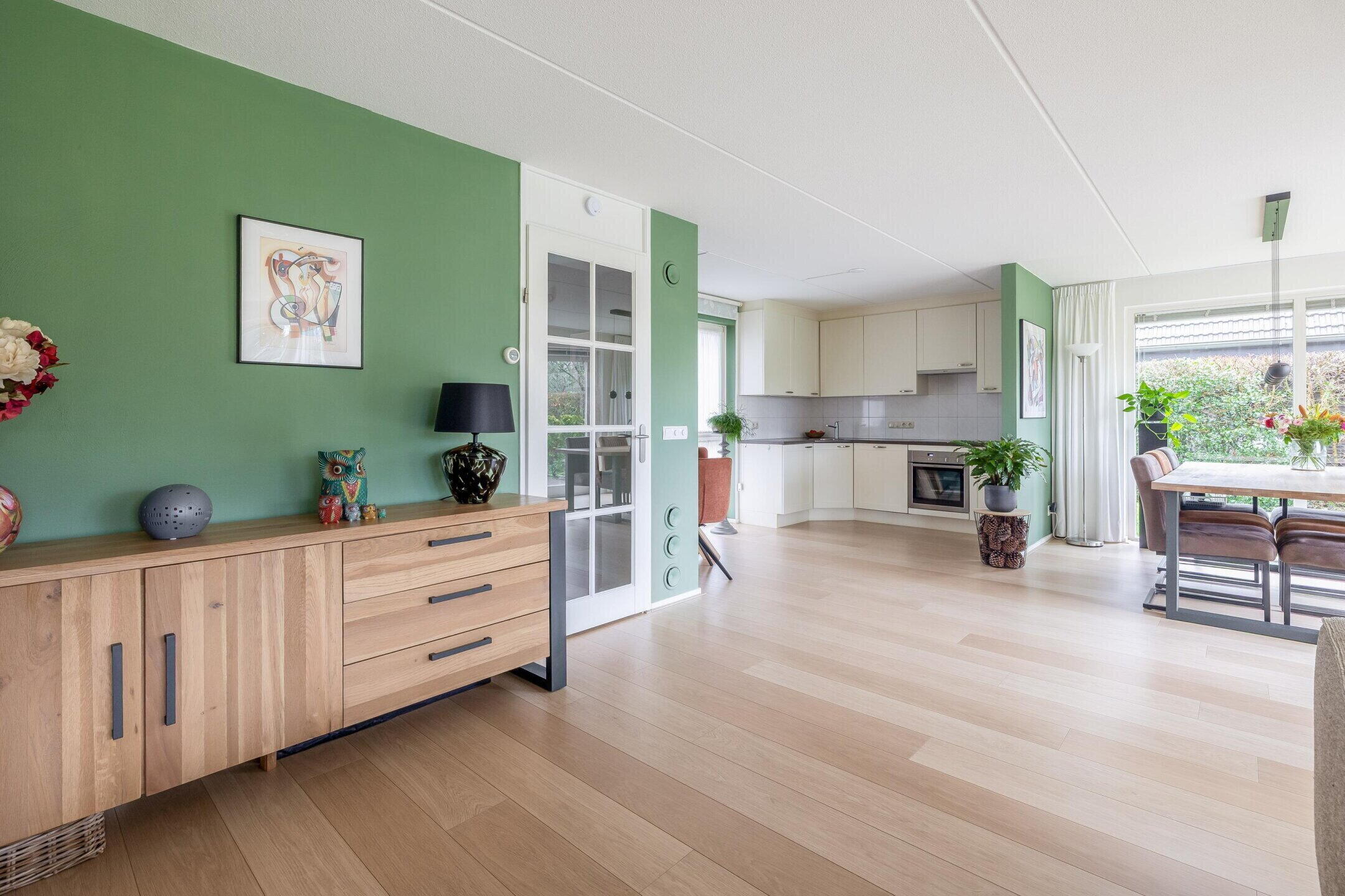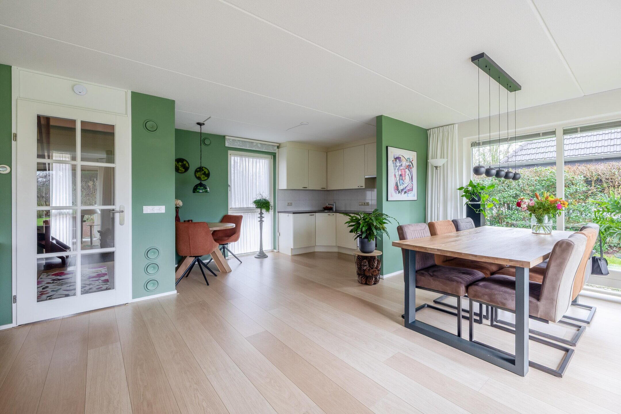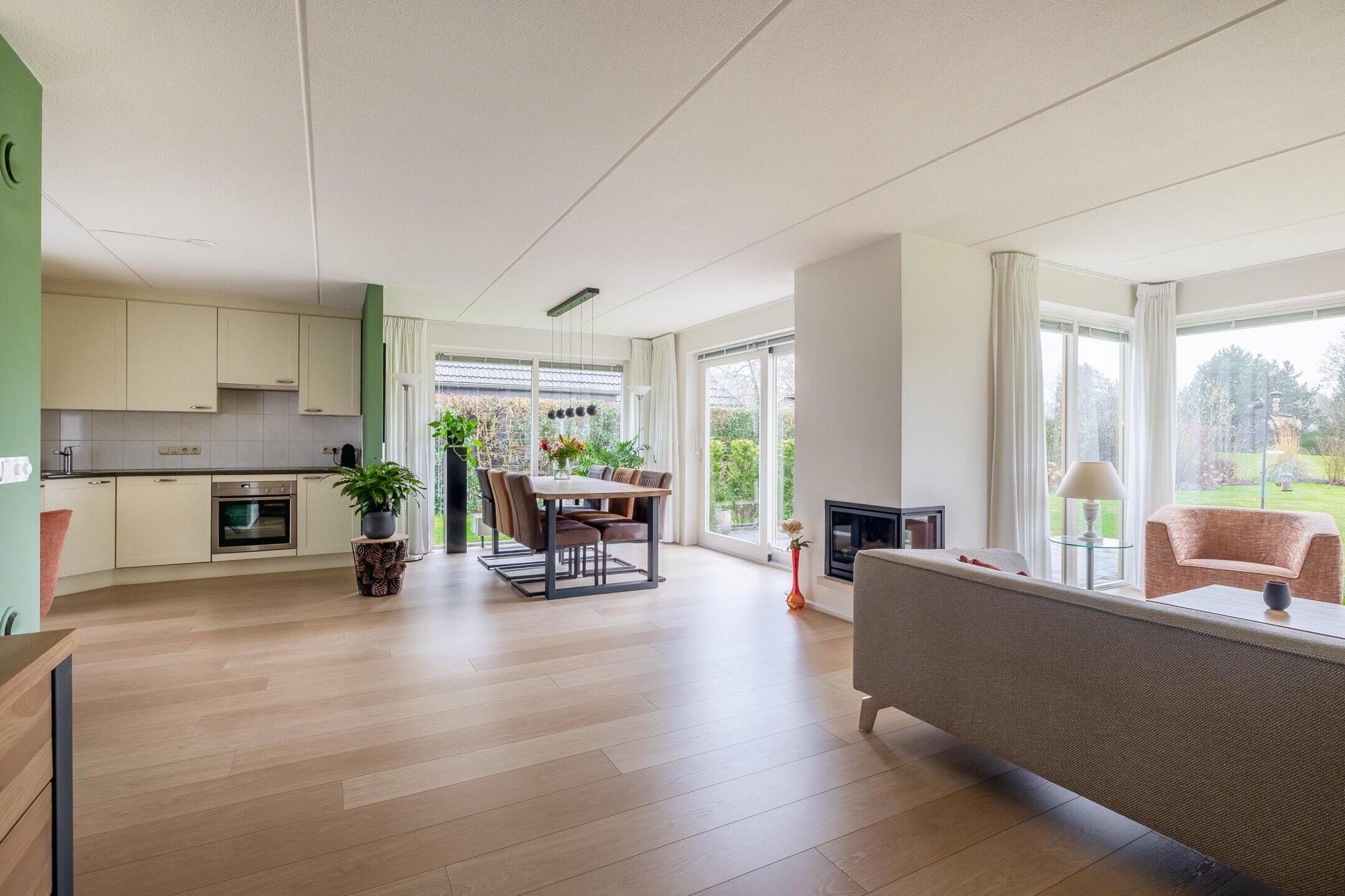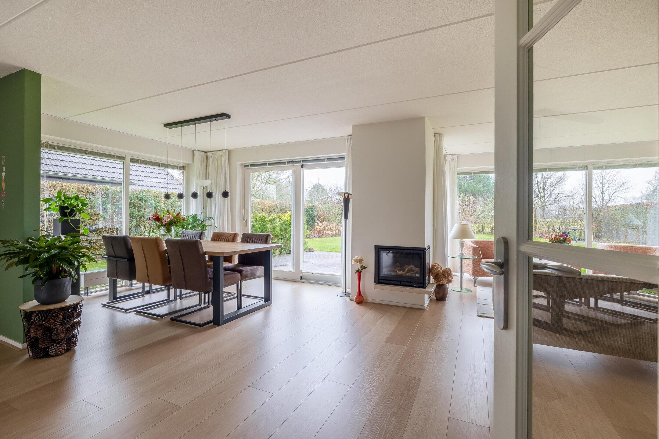 Je komt binnen in de hal met garderobenis (met daarachter de meterkast welke van buitenaf te bereiken is), keurig toilet met fonteintje, trapopgang en toegang tot zowel de woonkamer met open keuken als de bijkeuken. De ruime, lichte living is voorzien van grote ramen tot op de grond, de serre zorgt voor extra licht en ruimte terwijl de open haard in het midden een warme sfeer brengt. Vanuit de eethoek bereik je via de schuifpui het terras en de tuin. De open keuken heeft een keukenblok in L-opstelling, in een lichte kleur met veel bergruimte en diverse inbouwapparatuur (oven, afzuigkap en vaatwasser). In de hoek van de keuken is nog voldoende ruimte voor een gezellig zitje of werkplek. Er ligt een nette laminaatvloer. Vanuit de hal kom je in de praktische bijkeuken met witgoedopstelling, bergruimte en een deur naar buiten.