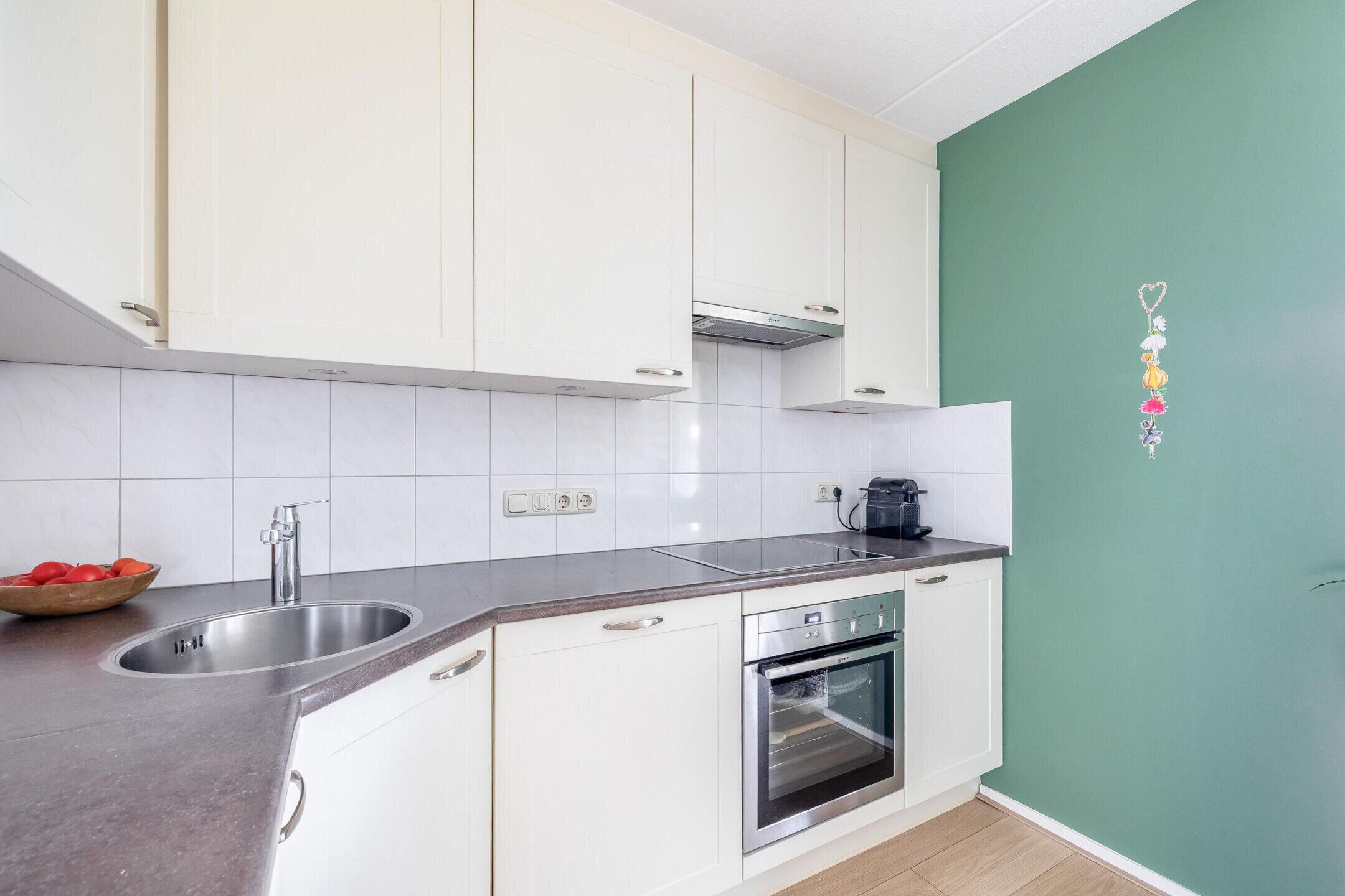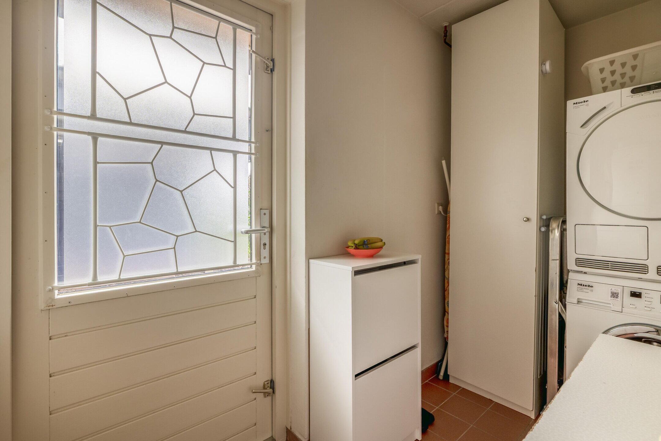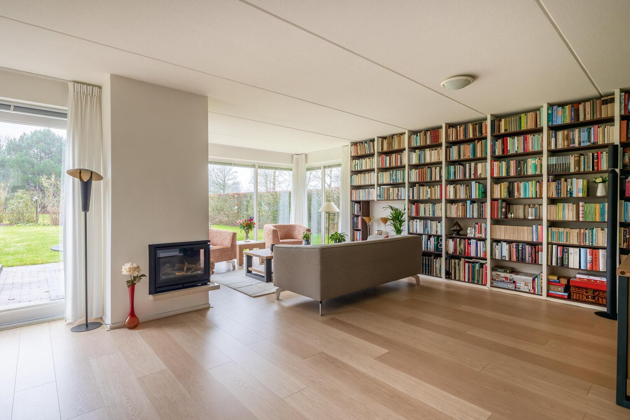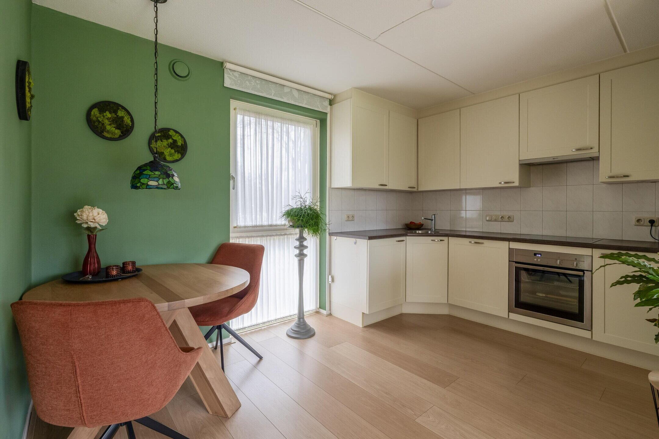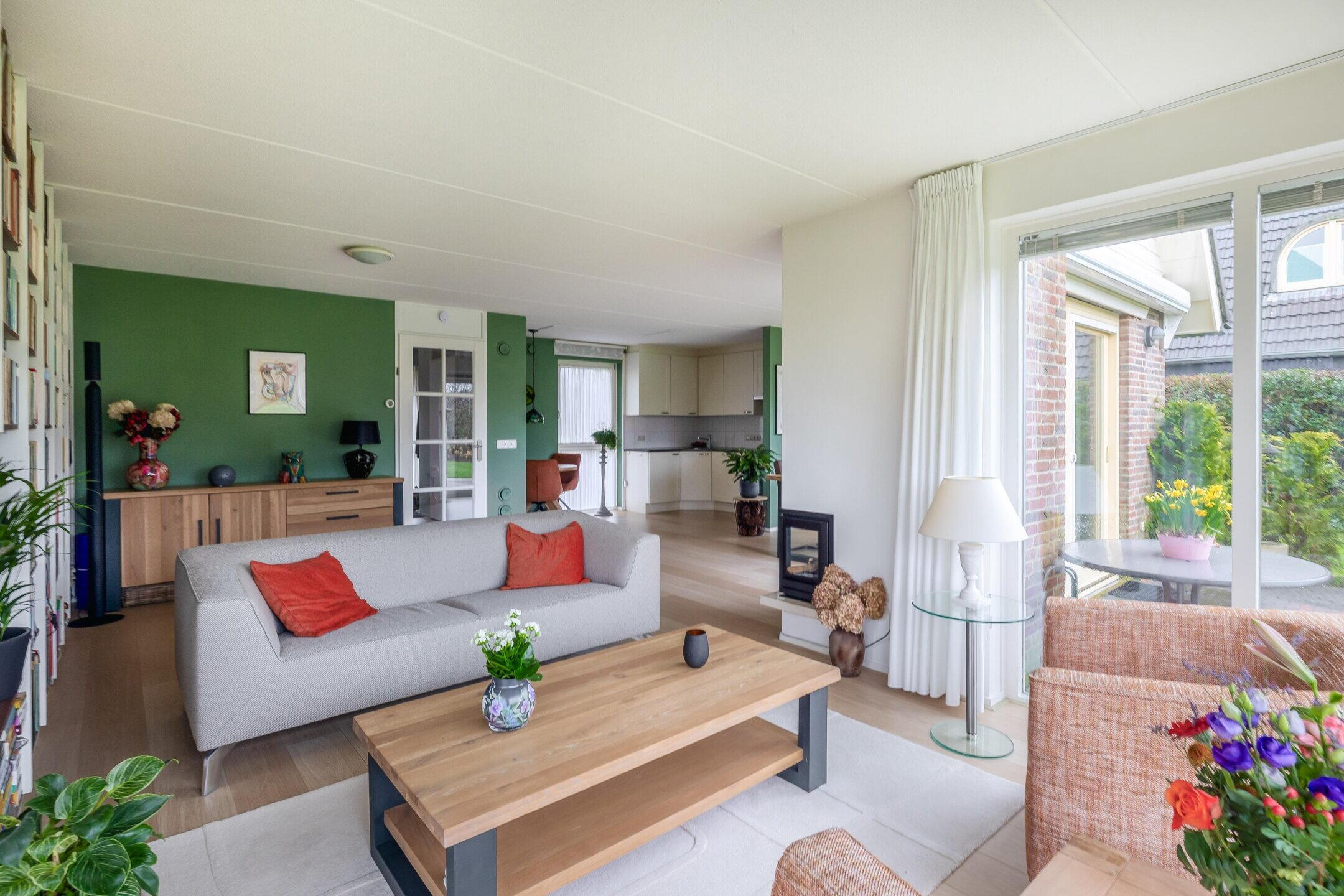 Je komt binnen in de hal met garderobenis (met daarachter de meterkast welke van buitenaf te bereiken is), keurig toilet met fonteintje, trapopgang en toegang tot zowel de woonkamer met open keuken als de bijkeuken. De ruime, lichte living is voorzien van grote ramen tot op de grond, de serre zorgt voor extra licht en ruimte terwijl de open haard in het midden een warme sfeer brengt. Vanuit de eethoek bereik je via de schuifpui het terras en de tuin. De open keuken heeft een keukenblok in L-opstelling, in een lichte kleur met veel bergruimte en diverse inbouwapparatuur (oven, afzuigkap en vaatwasser). In de hoek van de keuken is nog voldoende ruimte voor een gezellig zitje of werkplek. Er ligt een nette laminaatvloer. Vanuit de hal kom je in de praktische bijkeuken met witgoedopstelling, bergruimte en een deur naar buiten.