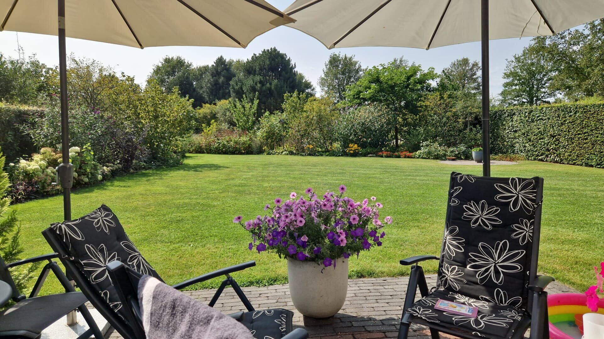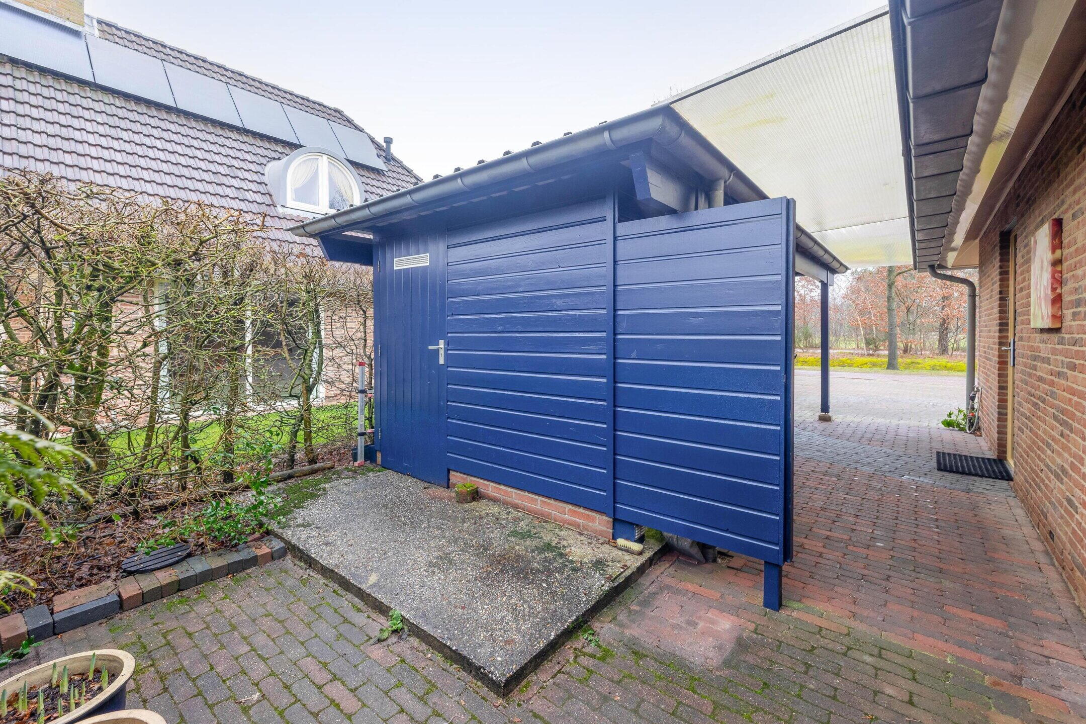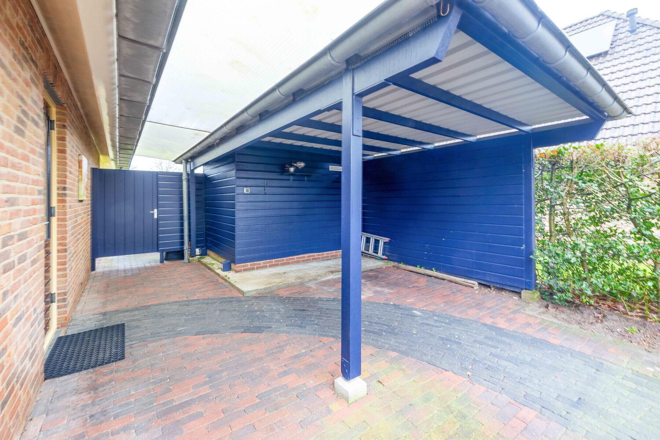 De woning heeft een eigen oprit. De verzorgd aangelegde tuin, met heg rondom en enkele borders en diverse bosschage, biedt volop privacy en ontspanning en heeft een beregeningsinstallatie. Het terras achter de woning heeft een zonnescherm dat voor de nodige schaduw zorgt. Je hebt vanuit de tuin directe toegang tot de 6 holes golfbaan tussen de woningen. De carport en de vrijstaande houten berging, die volledig onderkelderd is, bieden extra gemak.